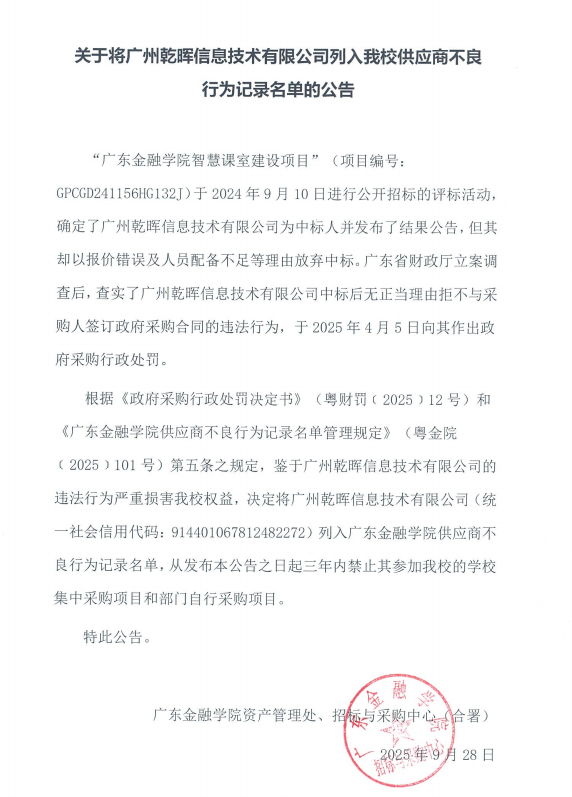 关于将广州乾晖信息技术有限公司列入我校供应商不良行为记录名单的公告